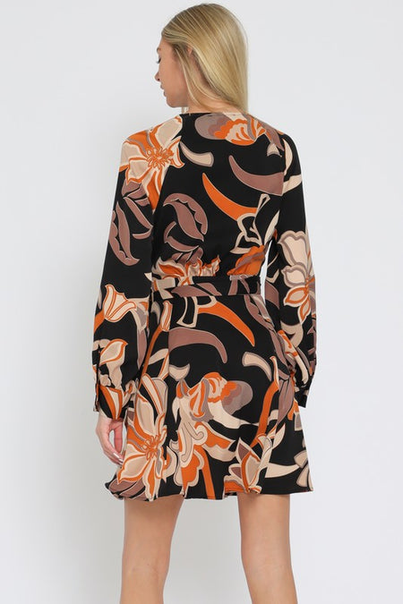 Black Beige Long Sleeve Wrap Mini Dress